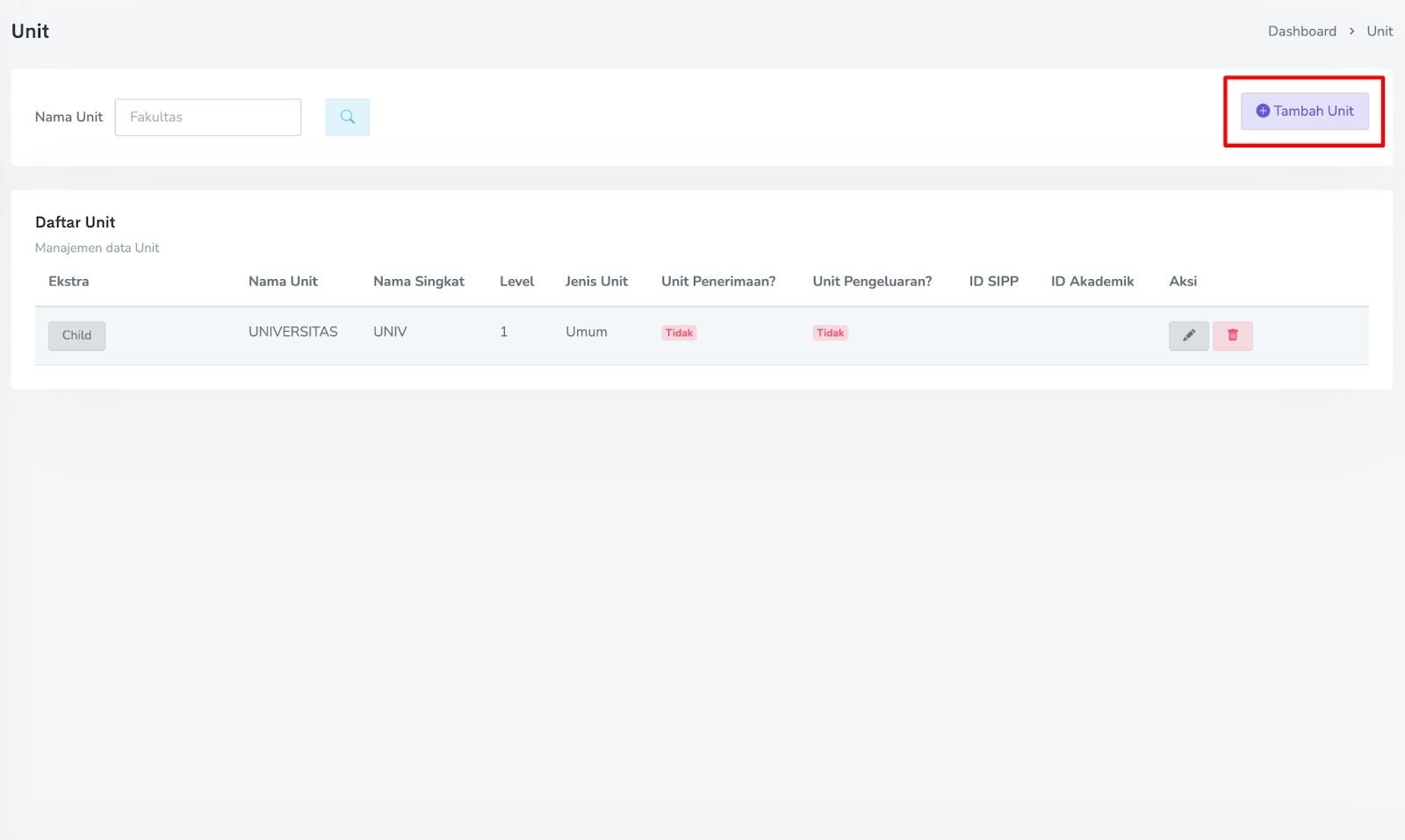 Untuk menambahkan Unit, klik tombol Tambah Unit pada menu Unit.